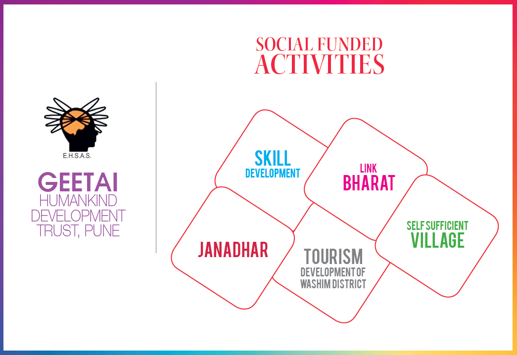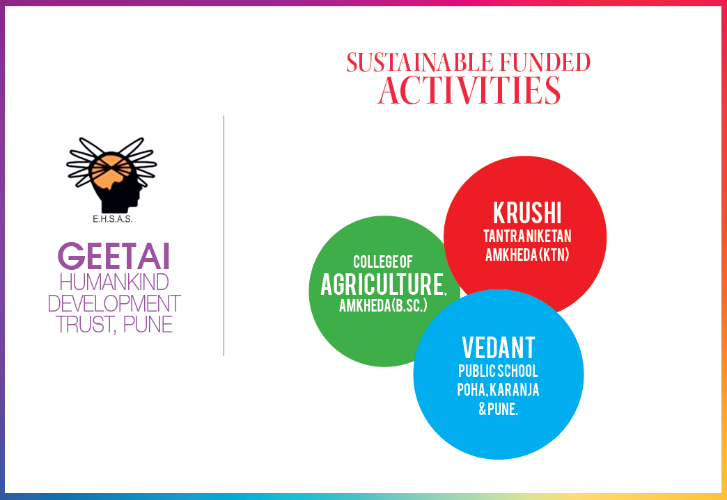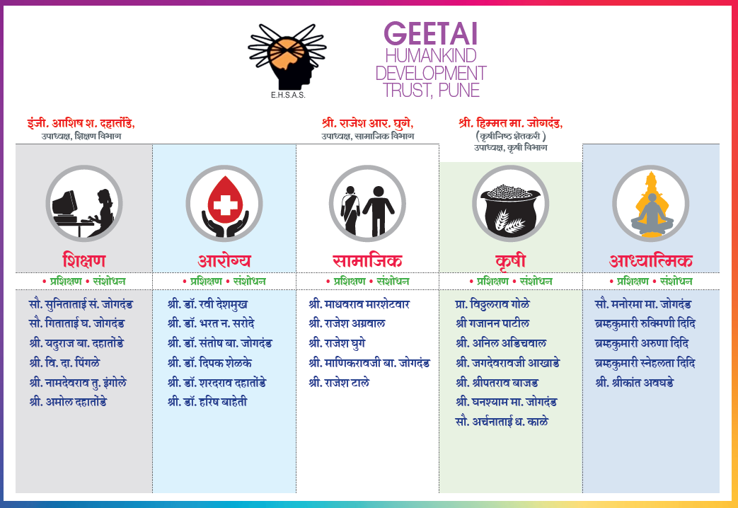 " The Best Way To Find Yourself Is To Lose Yourself In The Service Of Others. A Few People Of Integrity Can Go A Long Way. We Are Ready To Uphold The Values And Advancing The Work In Various Aspects. Our Institute Is Driven And Task-oriented By One Common Interest. We Are Flexible In Becoming Accustomed To The Needs. We Provide A Mechanism That Will Strengthen And Empower The Needy People Which Will Bring Some Significant Benefits ". Human Being Is An Integral Part Of The Society. While Living In The Society,We Are Obliged With Some Social Constraints & Responsibilities. It Is Said That "Service To Man Is Service To God". By Keeping This Visionary Approach In Mind We've Stepped Into Invigorating World Of Social Service. For The Very Noble Cause Of Social indebtedness,'GEETAI'Was Established. There Is No Tool For Development More Effective Than The Empowerment... The Prevalence Of The Vinoba Bhave’s Famous Geetai And By Keeping Ideals Of Vinoba Bhave In Mind, Geetai Humankind Development Trust Established In 2001-02 Under The Guidance Of Shri. Ram Babaraoji Jogdand (President And Managing Director Of Ramelex Pvt Ltd), Mr. Chandrashekhar Haribhau More (Chairman And Managing Director Of More Modular Pvt Ltd) And Mr. Bharat Went Down By The Guidance Of Nathuji Saroda (Renowned Psychiatrist). Today, The Organization Has Made Progress Mainly In The Field Of Five. It Includes Five Important Areas Which Cover The Life Of Education, Health, Social, Agricultural And Spiritual (EHSAS). With The Help Of Research, Awakening And Training, 'Geetai Humankind Development Trust' Has Been Working Very Successfully In Fulfilling The Objectives Of The Organization And Working Very Successfully In This Field. The Organization Started Implementing Various Programs Following The Ideology Of Thoughts, If Nothing Is Impossible. Till Now, Without Any Donations, The 'Geetai Human Kind Development Trust' Has Proceeded. All The Expenses Of This Journey Are Being Done By The President And Trustee Of The Organization. The Institute Has Performed Very Well In The Education Sector And 5 Schools And 2 Agricultural Colleges Are Run By The Organization.